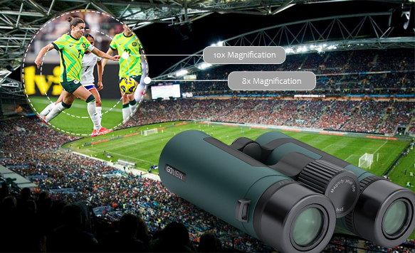 For large football stadiums, 8x to 10x magnification offers the best balance of clarity and stability. This range provides: